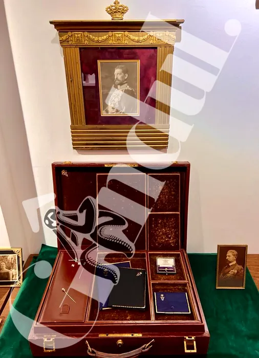 Geanta Hermes în care Regele Ferdinand păstra bijuteriile, colanele și decorațiile + portofele Hermes care au aparținut Regelui