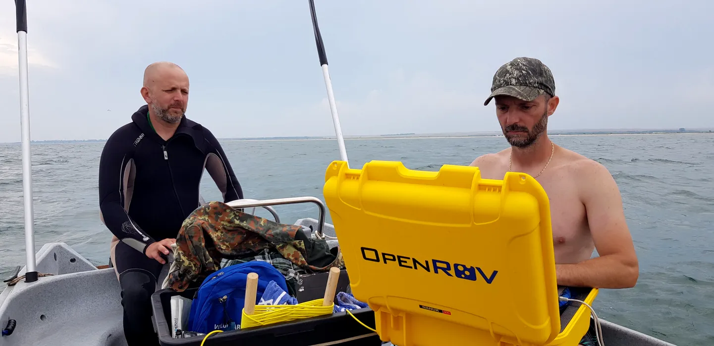 Biologul marin Răzvan Popescu-Mirceni și Răzvan Zaharia fac cercetări submarine cu robot subacvatic (ROV) de la bordul șalupei Delphis
