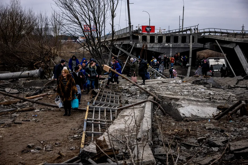 Evacuees cross a destroyed bridge as they flee the city of Irpin, northwest of Kyiv, on March 7, 2022. Ukraine dismissed Moscow's offer to set up humanitarian corridors from several bombarded cities on March 7, 2022, after it emerged some routes would lead refugees into Russia or Belarus. The Russian proposal of safe passage from Kharkiv, Kyiv, Mariupol and Sumy had come after terrified Ukrainian civilians came under fire in previous ceasefire attempts.,Image: 666787557, License: Rights-managed, Restrictions: , Model Release: no, Credit line: Profimedia