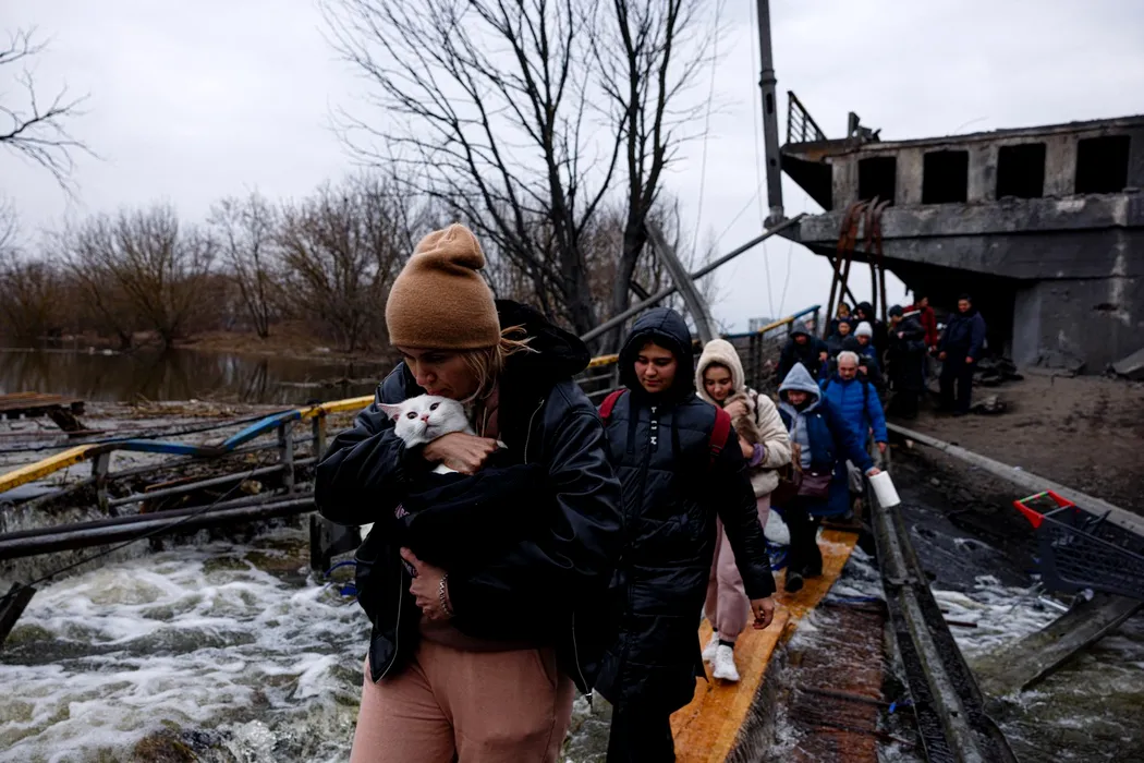 A woman carries her pet cat as evacuees cross a destroyed bridge as they flee the city of Irpin, northwest of Kyiv, on March 7, 2022. Ukraine dismissed Moscow's offer to set up humanitarian corridors from several bombarded cities on Monday after it emerged some routes would lead refugees into Russia or Belarus. The Russian proposal of safe passage from Kharkiv, Kyiv, Mariupol and Sumy had come after terrified Ukrainian civilians came under fire in previous ceasefire attempts.,Image: 666788181, License: Rights-managed, Restrictions: , Model Release: no, Credit line: Profimedia