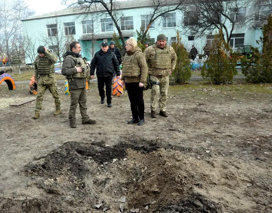 February 19, 2022, Stanytsia Luhanska, Luhansk Region, Ukraine: STANYTSIA LUHANSKA, UKRAINE - FEBRUARY 19, 2022 - Head of the Luhansk Regional State Administration and Civil-Military Administration Serhii Haidai (2nd L) and Deputy Prime Minister - Minister for Reintegration of the Temporarily Occupied Territories of Ukraine Iryna Vereshchuk (2nd R) visit the kindergarten that came under fire from Russian occupation forces on February 17, Stanytsia Luhanska, Luhansk Region, eastern Ukraine. (Credit Image: © Oleksii Kovalov/Ukrinform via ZUMA Press Wire)