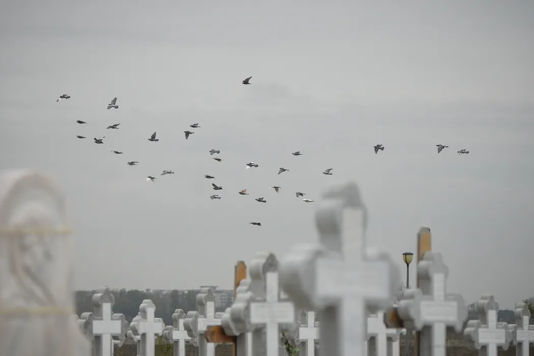 Un stol de pasari zboara deasupra crucilor din cimitirul Militar Ghencea III, in timpul comemorarii politistului motociclist Bogdan Gigina, decedat in urma cu un an din cauza unui accident petrecut pe strada Stirbei Voda, atunci cand se afla coloana oficiala a ministrului Gabriel Oprea, in Bucuresti, joi, 20 octombrie 2016. ANDREEA ALEXANDRU / MEDIAFAX FOTO