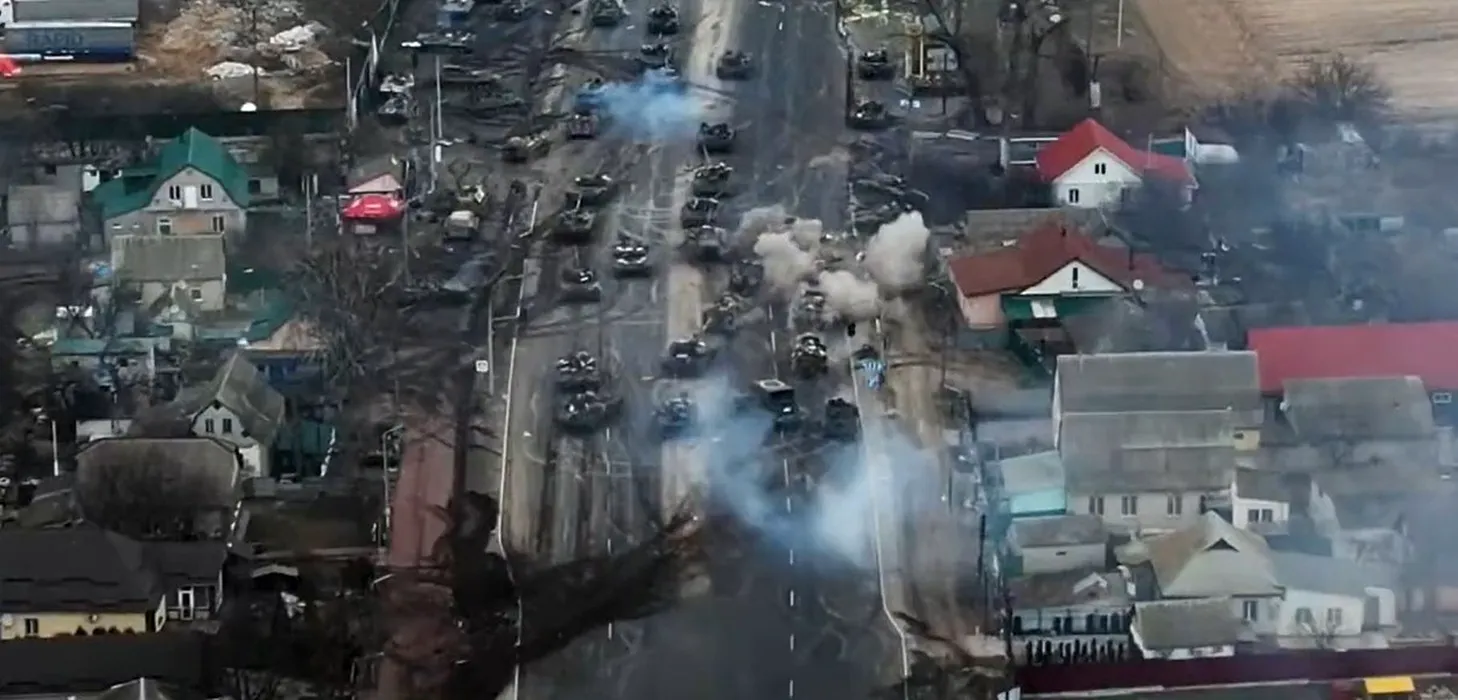 This incredible drone footage, released by the Ukrainian Army, shows an attack on a Russian tank column near Brovary to the Kyiv's North East.