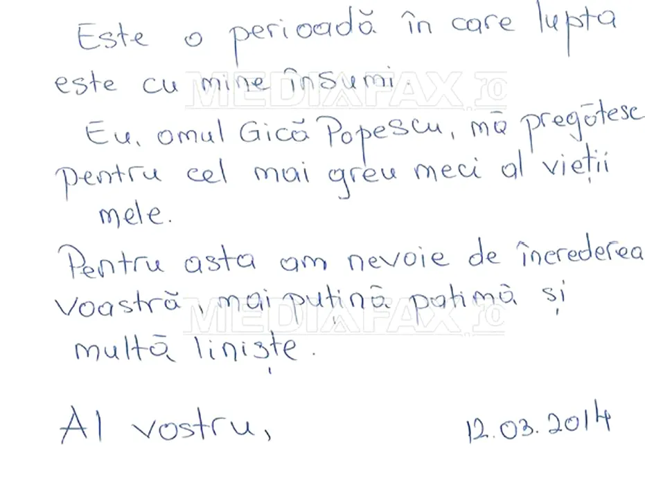 EXCLUSIV MEDIAFAX. SCRISOAREA LUI GICĂ POPESCU DIN ÎNCHISOARE. „Nu vreau ca situația în care mă aflu să nască nici disensiune, nici compasiune”