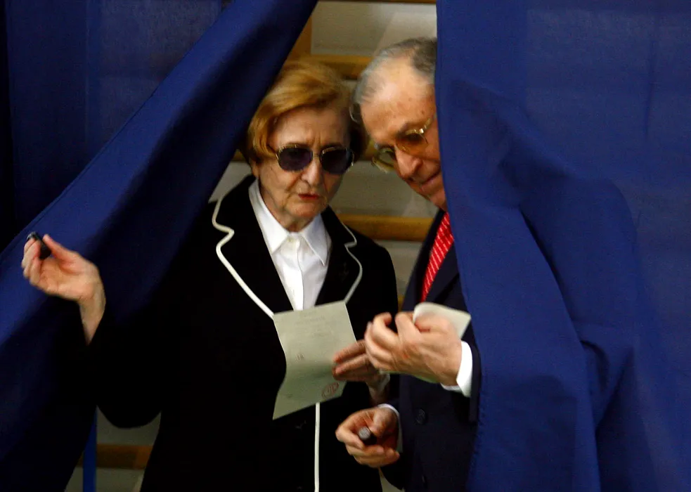 Ion Iliescu si sotia ies din cabina de votare, dupa ce si-au exprimat optiunea la referendumul privind demiterea presedintelui Traian Basescu, in Bucuresti, sambata, 19 mai 2007. BOGDAN MARAN / MEDIAFAX FOTO