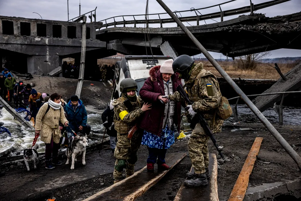 Ukrainian soldiers help an elderly woman to cross a destroyed bridge as she evacuates the city of Irpin, northwest of Kyiv, on March 7, 2022. Ukraine dismissed Moscow's offer to set up humanitarian corridors from several bombarded cities on Monday after it emerged some routes would lead refugees into Russia or Belarus. The Russian proposal of safe passage from Kharkiv, Kyiv, Mariupol and Sumy had come after terrified Ukrainian civilians came under fire in previous ceasefire attempts.,Image: 666771787, License: Rights-managed, Restrictions: , Model Release: no, Credit line: Profimedia