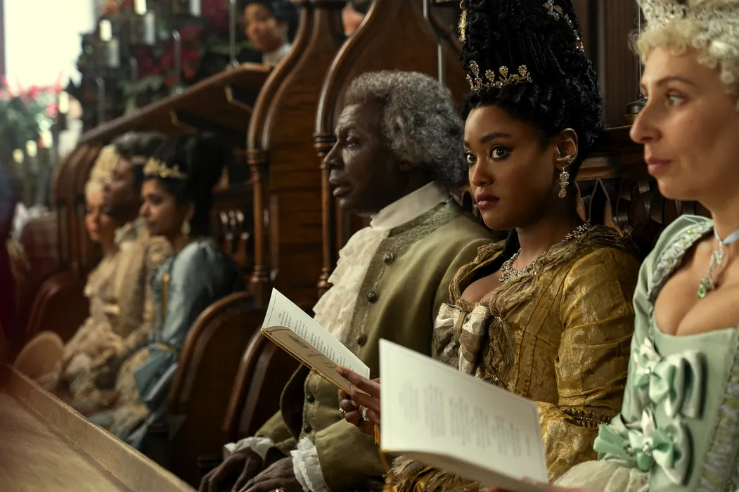 Queen Charlotte: A Bridgerton Story. (L to R) Cyril Nri as Lord Danbury, Arsema Thomas as Young Agatha Danbury in episode 101 of Queen Charlotte: A Bridgerton Story. Cr. Liam Daniel/Netflix © 2023