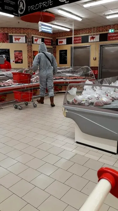 EXCLUSIV. Cum a ieșit azi un român la cumpărături. Este costumat în echipament complet de protecție pentru un „atac biologic”/ FOTO, VIDEO