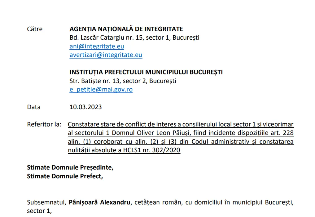EXCLUSIV | Urbanistul Alexandru Pânișoară a făcut o sesizare la ANI pe numele viceprimarului USR al Sectorului 1: „Toate actele semnate și emise de Oliver Păiuși sunt lovite de nulitate”