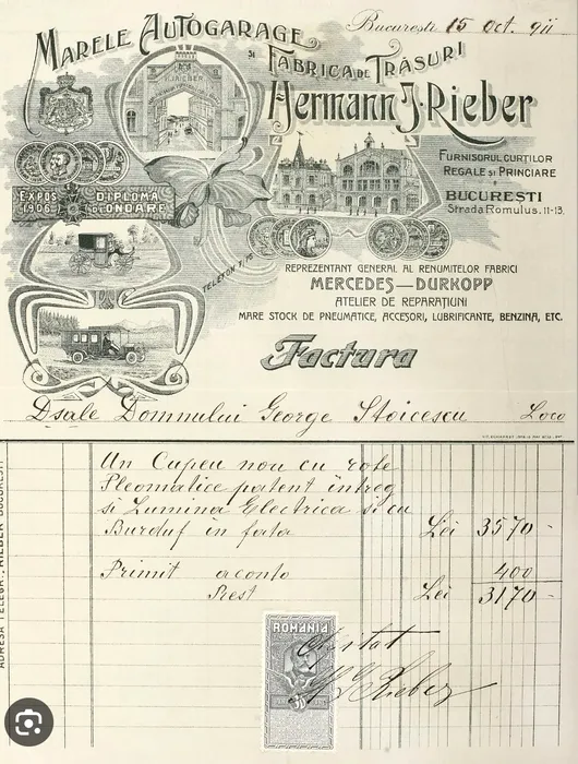 Factura pe care o primeau clienții care cumpărau trăsuri de lux sau autoturisme de la industriașul Hermann Rieber