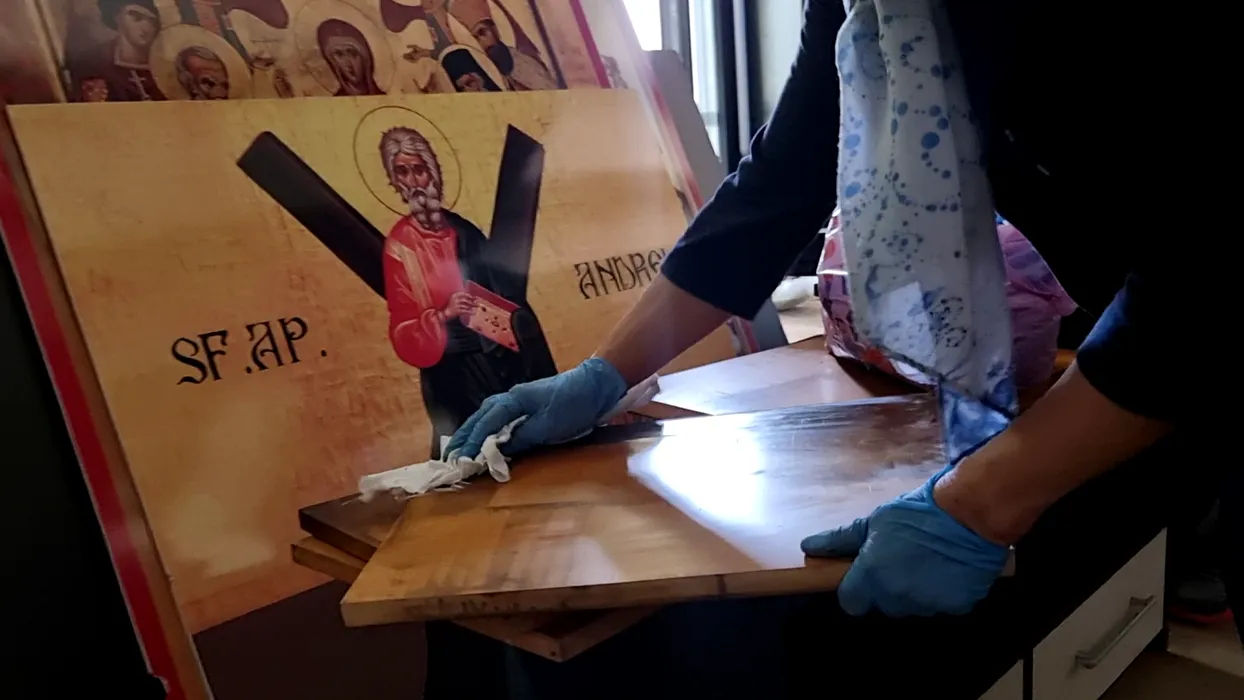 Localnicii curăță icoanele salvate din incendiul de la Mănăstirea Turnu. Sursa foto: GÂNDUL