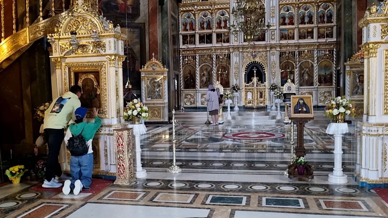 Doi tineri se roagă la icoana făcătoare de minuni a Maicii Domnului, de la Mănăstirea Ghighiu, Prahova