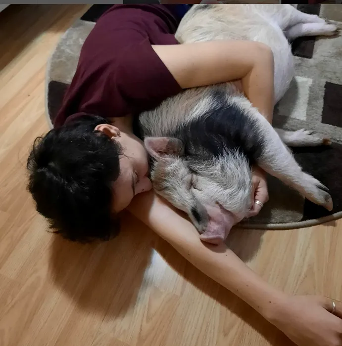 EXCLUSIV VIDEO | Singura purcelușă din România cu cont pe Instagram duce o viață de huzur. Are 120 de kilograme, căsuță de lux și se uită la filme