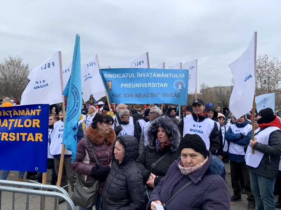 EXCLUSIV VIDEO | Sute de angajați din învățământ au protestat în fața Parlamentului pentru majorarea salariilor. „Să schimbăm salariile o lună, să vadă dacă se poate trăi cu 1.600 de lei. Ei și-au mărit salariile, nouă nu”