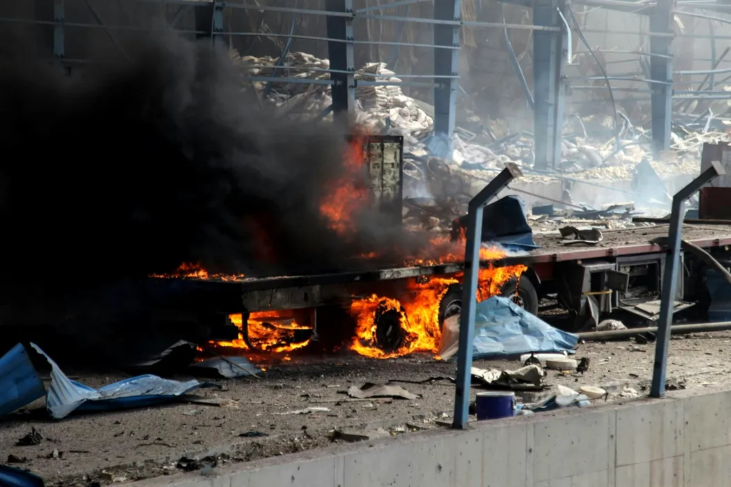 Flames engulf a truck along a devastated boulevard following an explosion at the Shahid Rajaee port dock southwest of Bandar Abbas in the Iranian province of Hormozgan on April 26, 2025. Several containers exploded on April 26 at Iran's largest commercial port, authorities said, causing a major blast and fire, and leaving hundreds injured. Shahid Rajaee, more than 1,000 kilometres (620 miles) south of the capital, is the most advanced container port in Iran, according to the official IRNA news agency.,Image: 992473541, License: Rights-managed, Restrictions: , Model Release: no