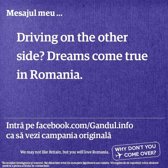 Facebook a șters aplicația Gândul prin care cititorii își scriau propriile afișe în campania „Why don”t you come over?”. Aplicația va fi implementată pe gandul.info. GALERIE FOTO