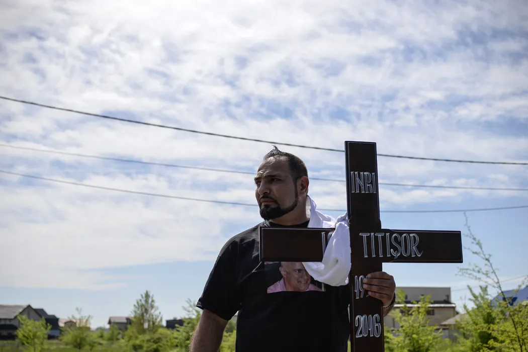 Un barbat transporta crucea lui Ion Titisor, cunoscut sub numele de Fane Spoitoru, inainte de slujba de inmormantare a acestuia in comuna Cernica, judetul Ilfov, sambata, 16 aprilie 2016. Ion Titisor, cunoscut drept Fane Spoitoru, a fost inmormantat sambata, la cimitirul Bellu Militar din Bucuresti. ANDREEA ALEXANDRU / MEDIAFAX FOTO