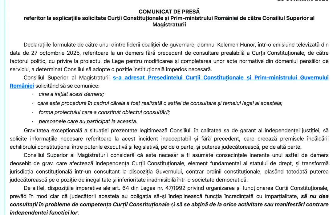 Fără precedent: CSM acuză Guvernul Bolojan și pe Kelemen Hunor că au afectat independența Curții Constituționale. Justiția îi cere lui Bolojan și CCR să spună ADEVĂRUL despre discuțiile subterane purtate pe tema pensiilor magistraților