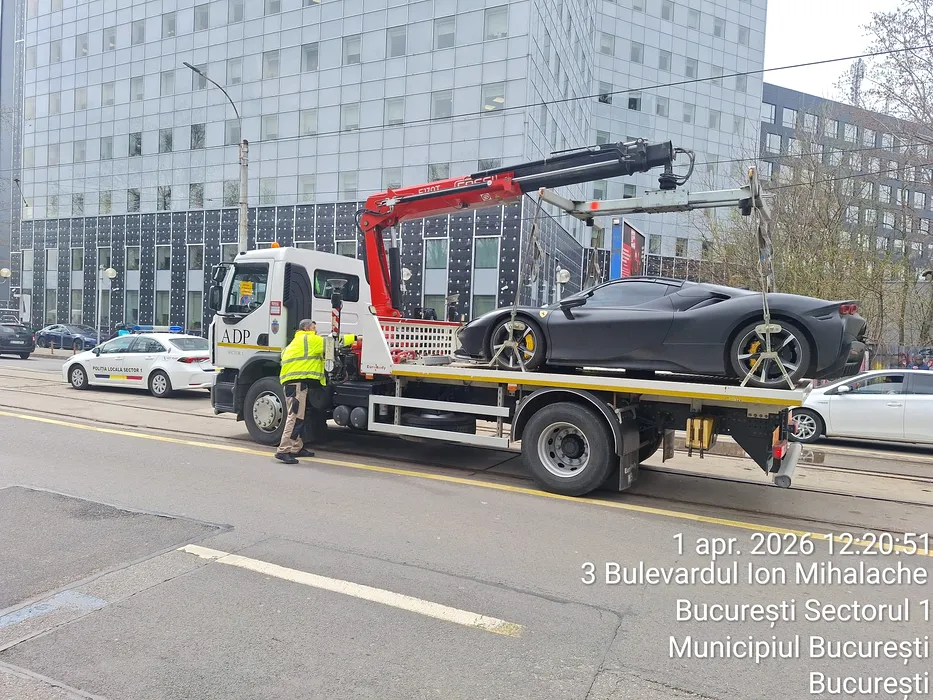 Ferrari parcat pe linia tramvai, în București, ridicat de pe șine de polițiștii locali. Cât poate costa mașina și ce amendă a plătit proprietarul