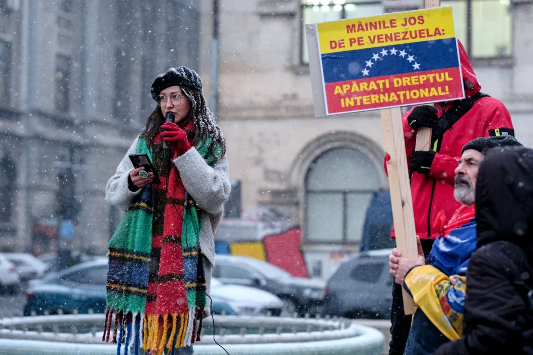 GALERIE FOTO: Fiica Elenei Lasconi protestează în Piața Universității față de capturarea lui Maduro. “Trump, jos labele de pe Venezuela”