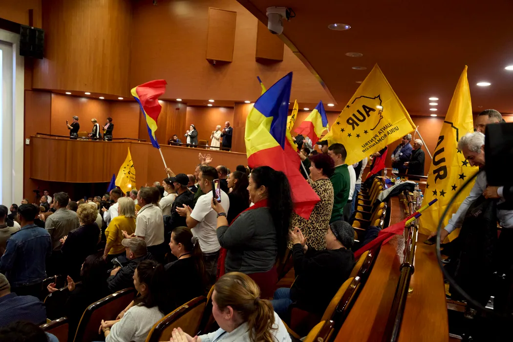 Filiala judeţeană AUR Călăraşi şi-a ales liderul pe întuneric. De pe scenă, George Simion i-a acuzat pe „mafioţii locali” de sabotaj. Până la urmă, au luminat sala cu lanternele de la telefon