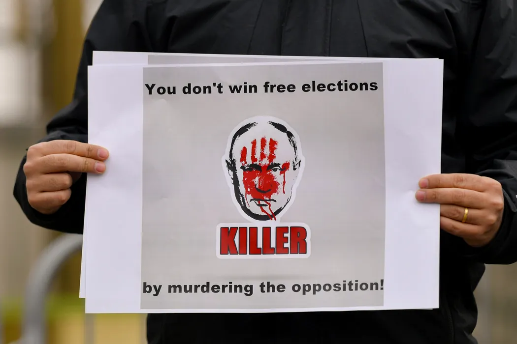 Un barbat afiseaza o pancarta in timpul unui eveniment organizat in memoria liderului opozitiei ruse, Aleksei Navalnii, in fata sediului ambasadei Rusiei la Bucuresti, duminica, 18 februarie 2024. Aleksei Navalnii a decedat intr-un penitenciar din regiunea siberiana, unde ispasea o pedeapsa de 30 ani pentru extremism. ALEXANDRU DOBRE/ MEDIAFAX FOTO.