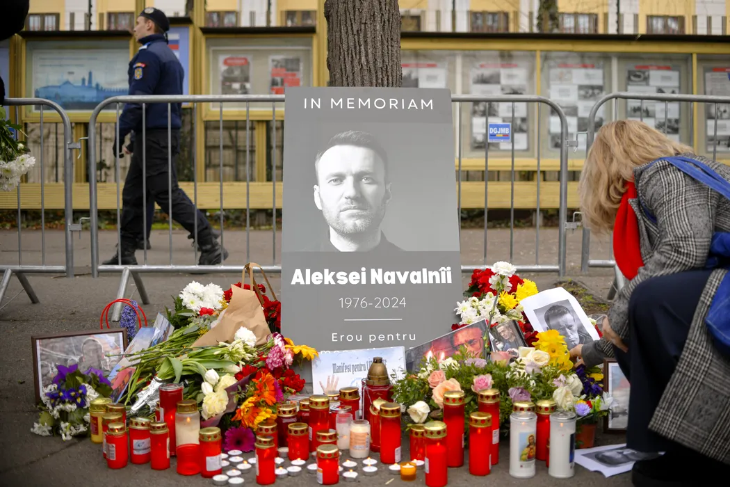 O femeie aseaza un buchet de flori langa fotografia liderului opozitiei ruse, Aleksei Navalnii, in timpul unui eveniment de comemorare organizat in fata sediului ambasadei Rusiei la Bucuresti, duminica, 18 februarie 2024. Aleksei Navalnii a decedat intr-un penitenciar din regiunea siberiana, unde ispasea o pedeapsa de 30 ani pentru extremism. ALEXANDRU DOBRE/ MEDIAFAX FOTO.