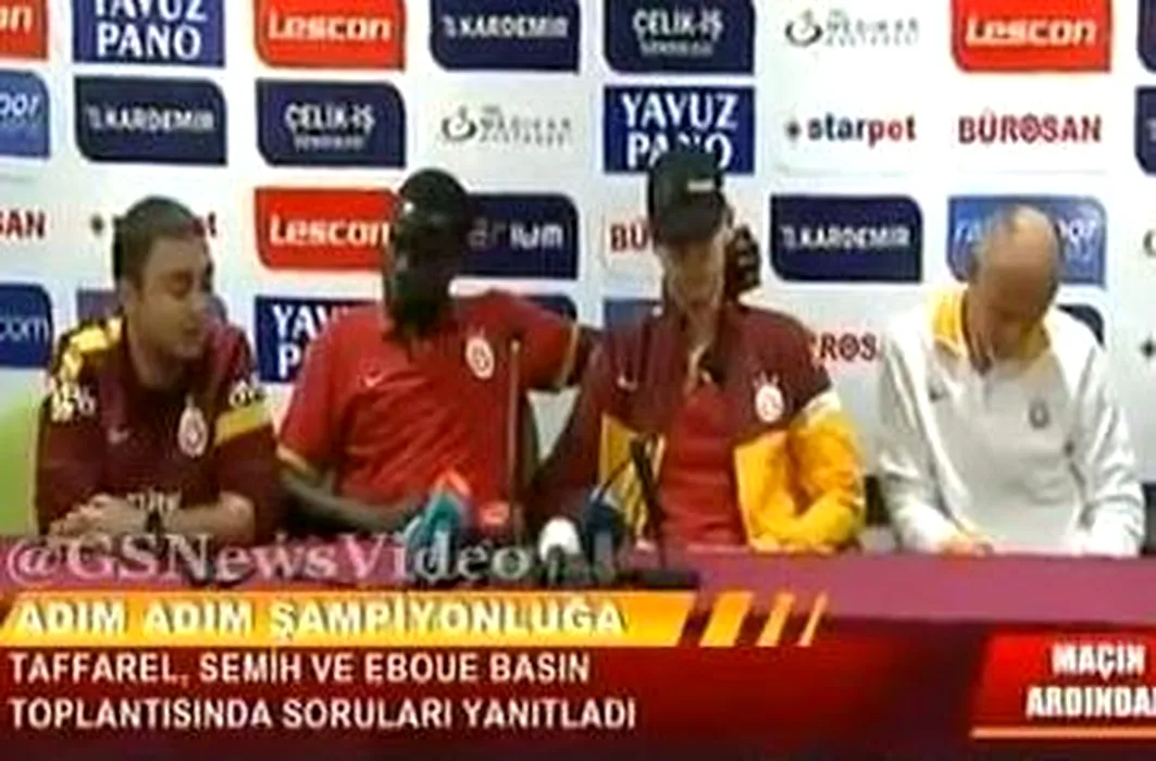 Fotbalistul Emmanuel Eboue, de la Galatasaray, surprins în ipostaze tandre cu un coechipier chiar în timpul unei conferințe de presă
