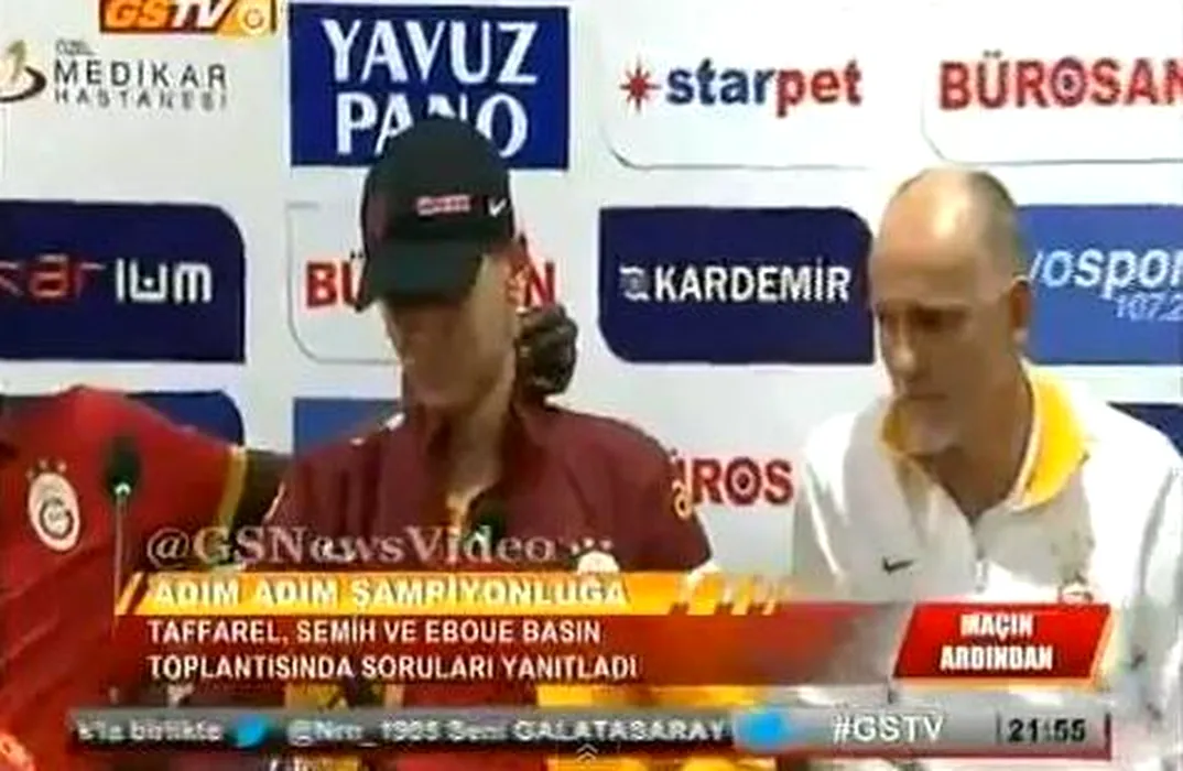 Fotbalistul Emmanuel Eboue, de la Galatasaray, surprins în ipostaze tandre cu un coechipier chiar în timpul unei conferințe de presă