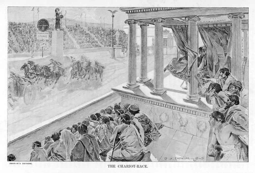 A chariot race takes place, watched eagerly by a large crowd. Date: ancient Source: Andre Castaigne in 'The Century, April 1896, page 811,Image: 21191274, License: Rights-managed, Restrictions: , Model Release: no