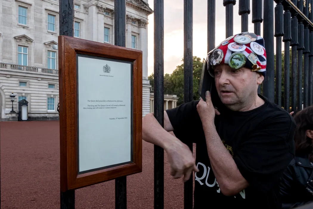 LONDON, UNITED KINGDOM - SEPTEMBER 08: A Royal fan speaks on the phone next to a notice informing of the death of Queen Elizabeth II displayed at the gate of Buckingham Palace in London, United Kingdom on September 08, 2022. Buckingham Palace has announced today that Queen Elizabeth II has died peacefully at Balmoral at the age of 96. Wiktor Szymanowicz / Anadolu Agency/ABACAPRESS.COM