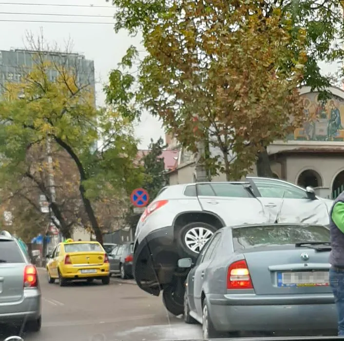 Gândul LIVE. Accident ca acesta nu s-a mai văzut în București! În ce poziție a rămas o mașină după o tamponare în centrul Capitalei