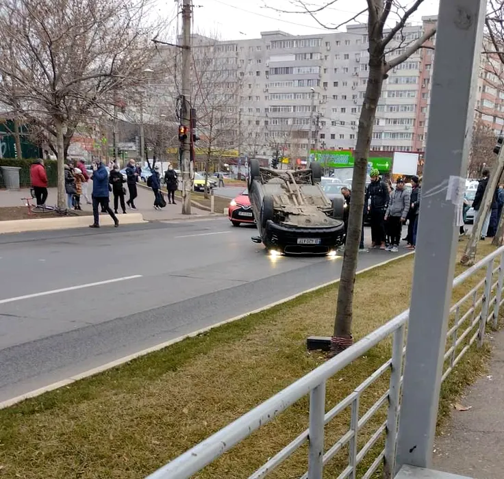 FOTO | Blocaj în zona Dristor din București, după ce un șofer a pierdut controlul volanului și s-a răsturnat