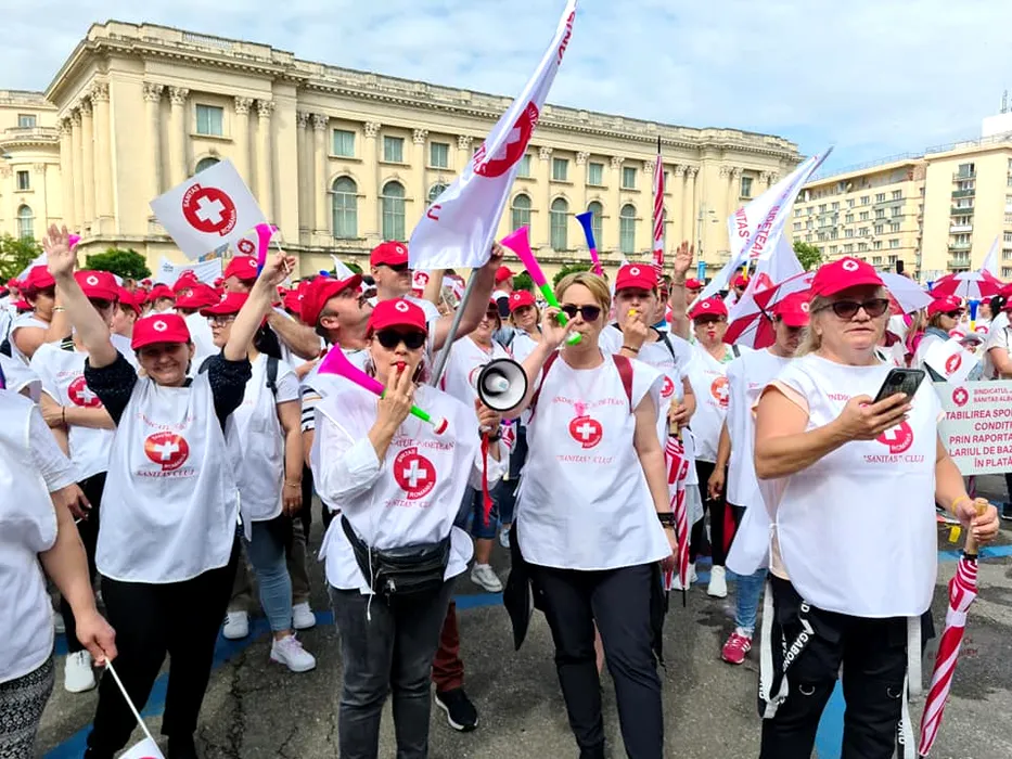 FOTO – VIDEO | Cadrele medicale și angajații din sistemul de asistență socială au ieșit în stradă și cer salarii mai mari: „Pensii speciale voi vă dați. Legea 153 nu o respectați”