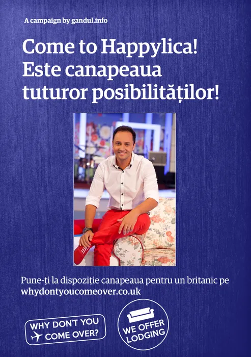 FOTO. Cătălin Măruță cheamă oaspeții britanici pe celebra „Happylica”, în campania „Why don”t you come over”. Le mulțumim românilor care și-au oferit canapeaua