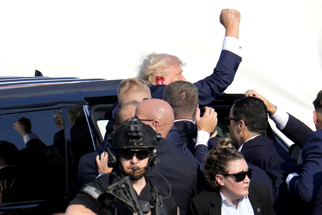 Republican presidential candidate former President Donald Trump pumps his fist as he is helped into a vehicle at a campaign event in Butler, Pa., on Saturday, July 13, 2024.,Image: 889553446, License: Rights-managed, Restrictions: This content is intended for editorial use only. For other uses, additional clearances may be required., Model Release: no