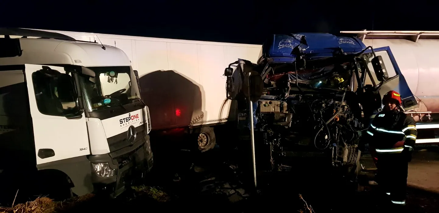 FOTO | Grav accident de circulație pe E85. Două TIR-uri s-au ciocnit, după ce unul dintre ele ar fi rămas fără frâne