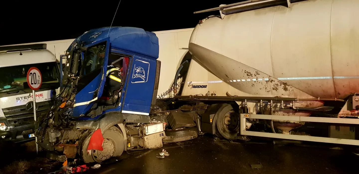 FOTO | Grav accident de circulație pe E85. Două TIR-uri s-au ciocnit, după ce unul dintre ele ar fi rămas fără frâne