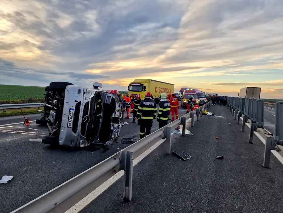VIDEO | Microbuz cu 11 persoane, răsturnat pe A1! O persoană a murit