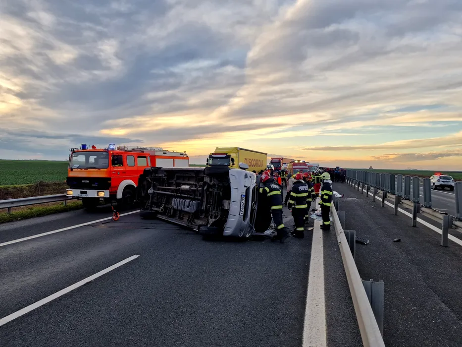 VIDEO | Microbuz cu 11 persoane, răsturnat pe A1! O persoană a murit