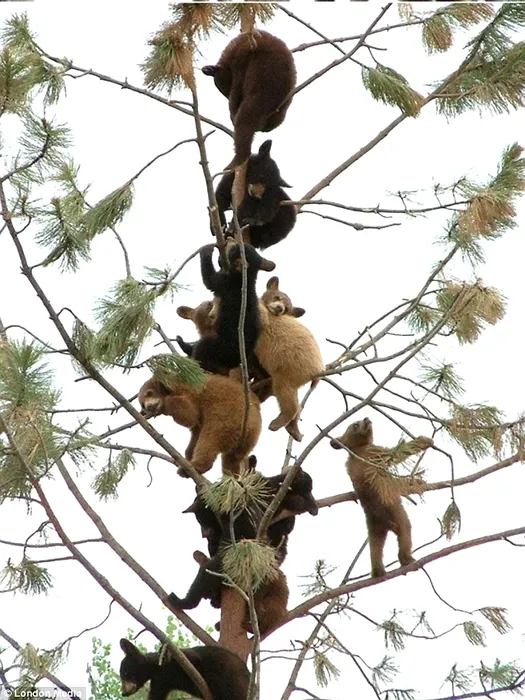 FOTO. Nu au rău de înălțime: puii de urs „au cucerit” vârful unui copac
