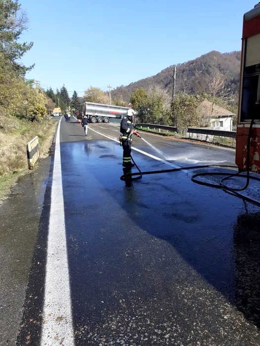 FOTO | O cisternă a derapat pe Valea Oltului din cauza borhotului scurs pe carosabil. Pompierii au fost chemați să curețe șoseaua