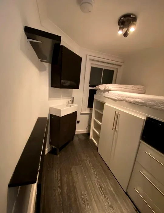 FOTO | O garsonieră de 7 metri pătrați, scoasă la vânzare pentru 50.000 de lire. Cuptorul cu microunde este incorporat în pat