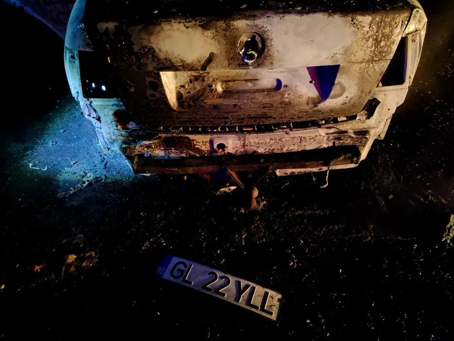 FOTO | O mașină în care se afla o tânără de 21 de ani a ars complet, după ce șoferița a intrat frontal într-un copac
