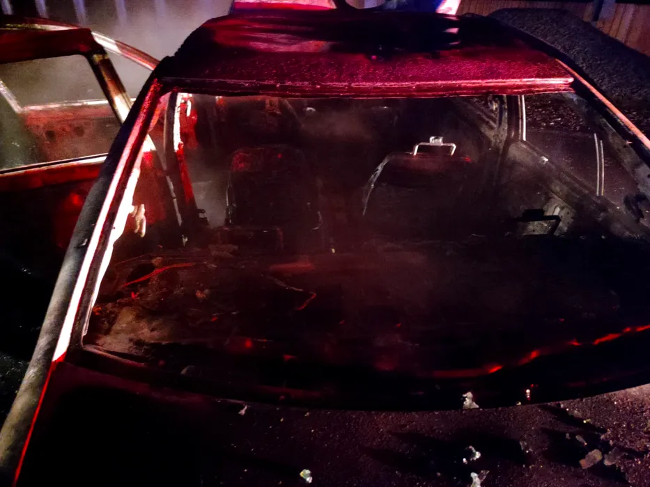 FOTO | O mașină în care se afla o tânără de 21 de ani a ars complet, după ce șoferița a intrat frontal într-un copac