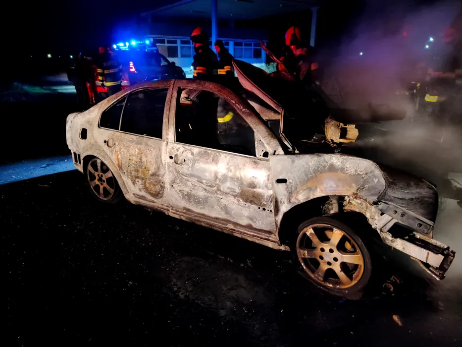 FOTO | O mașină în care se afla o tânără de 21 de ani a ars complet, după ce șoferița a intrat frontal într-un copac