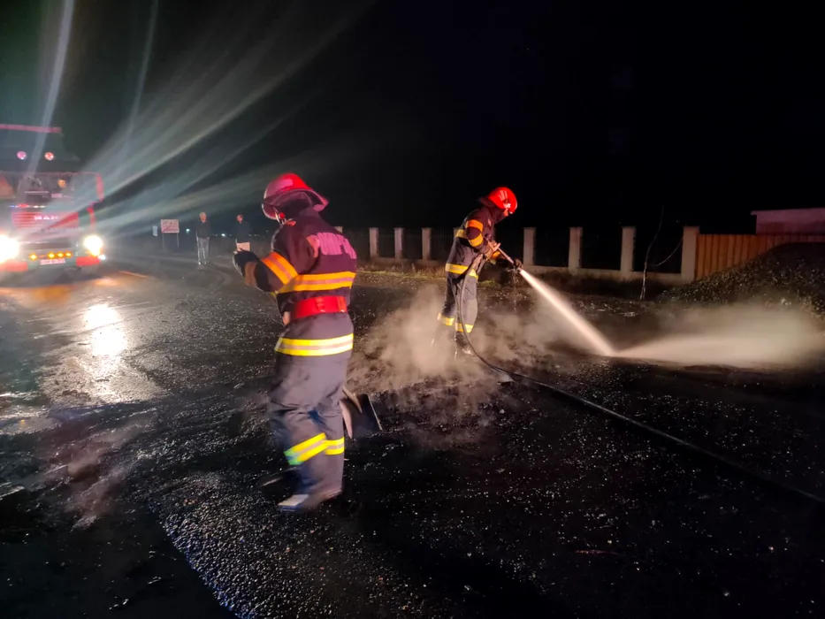 FOTO | O mașină în care se afla o tânără de 21 de ani a ars complet, după ce șoferița a intrat frontal într-un copac