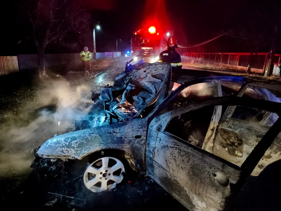 FOTO | O mașină în care se afla o tânără de 21 de ani a ars complet, după ce șoferița a intrat frontal într-un copac