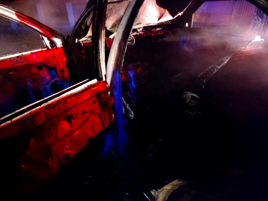 FOTO | O mașină în care se afla o tânără de 21 de ani a ars complet, după ce șoferița a intrat frontal într-un copac