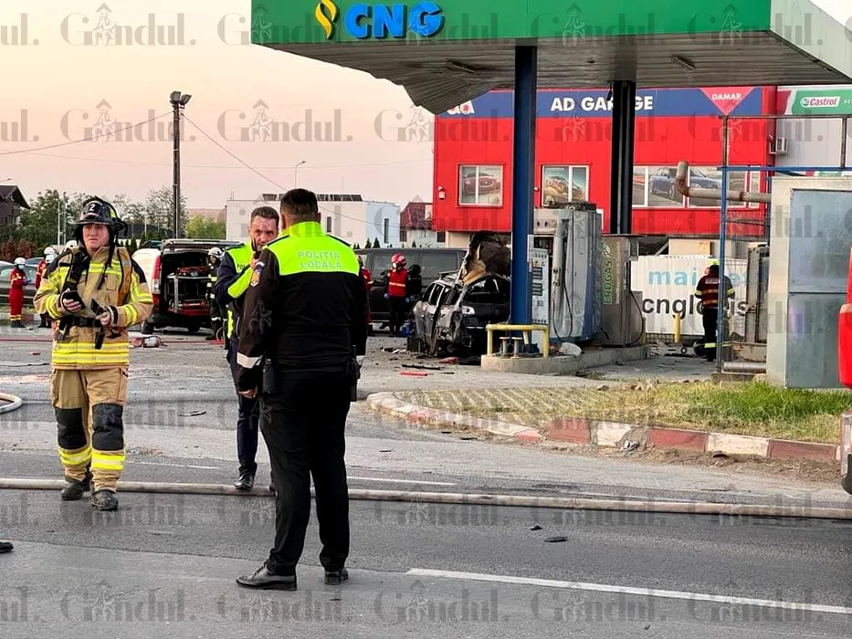 FOTO & VIDEO | O persoană a murit după ce o mașină a explodat într-o stație de încărcare cu gaz, lângă București